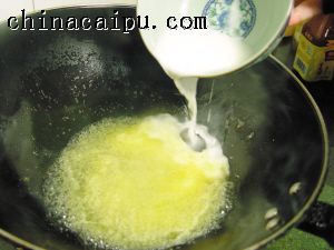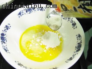 2 调炸浆:鸡蛋打入碗内,加入适量玉米粉和清水搅打均匀,以捞起炸浆往下倒不会断为准。