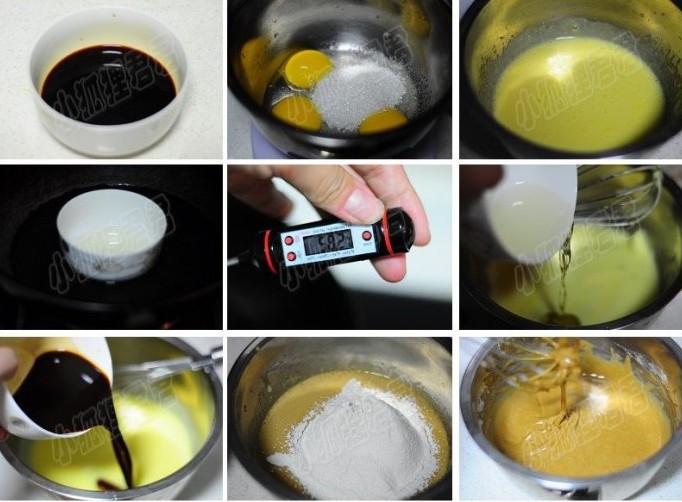 4、5、6、玉米油隔水加热,热到55-60度立刻慢慢倒入蛋黄糊中,搅拌均匀