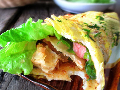 22。当看到蛋液将要凝固时,用铲子翻面。在饼上刷上一层酱汁。