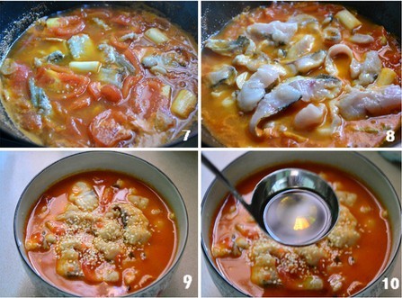 8、待锅内汤汁浓稠时,调入盐搅匀,去掉鱼片里的花椒和姜蒜,投入锅中大火煮至断生关火。