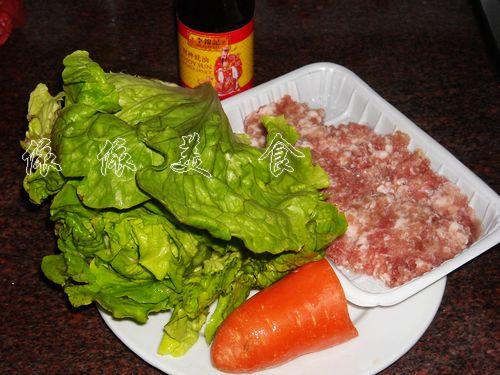 材料:生菜1棵(约210克),肉末250克,李锦记财神蚝油35ml,胡萝卜50克,面包糠15克