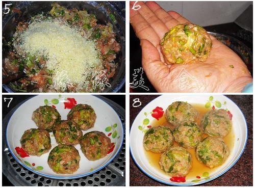 6、手中抹水,取大约50可的生菜肉馅,在两手掌中来回拍打,至丸子结实即可,依次把全部丸子做好(共可以做11个);