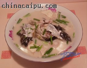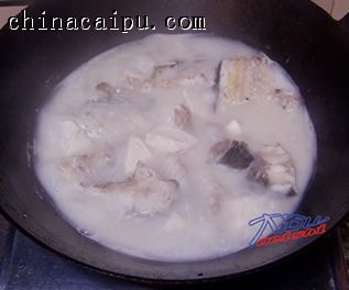 2、用沸水(不能用冷水)沿锅壁倒入,将鱼浸没,豆腐改刀入锅。旺火煮8-10分钟,至鱼汤成乳白时,加入精盐、味精调味。