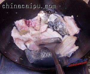 1、鱼头破成两半,剔去鱼牙;鱼脊椎骨砍成约二寸长断,鱼尾约留二寸长。锅中下油10克,用姜片、葱头爆香,提锅摇晃几下使锅壁粘油。将鱼头、鱼尾、鱼脊椎骨下锅旺火煎1分钟,反面再煎1分钟。