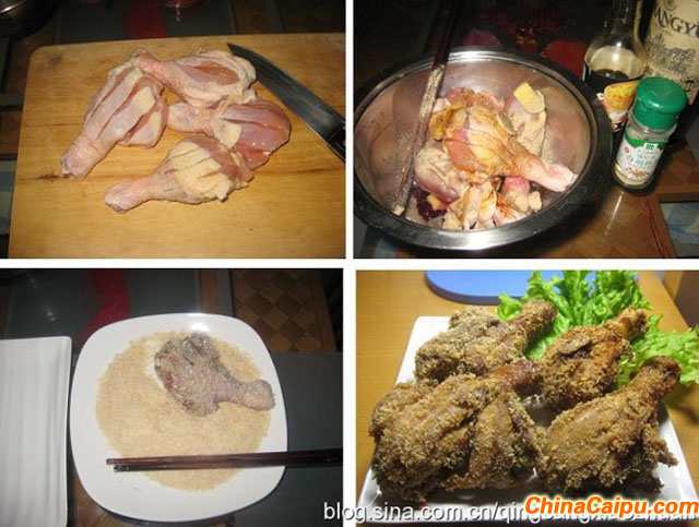 材料:鸡腿, 淀粉,鸡蛋,1 鸡腿划花刀,用盐,胡椒粉,香油,鸡精,料酒.葱,姜,拌匀,放在冰箱里腌制2个小时2 腌制好的鸡腿先裹上一层湿淀粉,再裹上一层鸡蛋液,3 待锅内油温七成热时,放入鸡腿,炸至鸡腿金黄色时,在转小火炸六至七分钟就ok拉ps:1 俺忘记卖炸鸡粉了,在裹上一层鸡蛋液之后,再裹上层炸鸡粉,味道可能会更好2 炸鸡腿的油温一定不要过高了,要用小火,这样才会外酥里嫩.