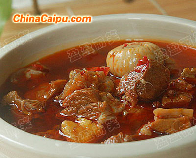 6、加入煮牛肉的清汤,适量盐,入高压锅40分钟左右,最后再加适量鸡粉调味即可。