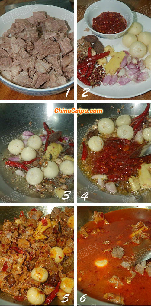 1、牛肉切稍大块,氽水后捞起,改刀小块,煮牛肉的汤不要倒掉,放一边,撇去浮沫后备用