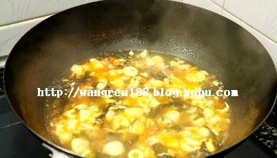 鸡腿菇菠菜手擀面 做法: 1、锅中油热后,放入蒜碎煸香,倒入西红柿煸软 2、放入鸡腿菇翻炒片刻,加入清水、黄酒大火烧开 3、撕丝紫菜放进去,加醋、生抽、盐、香油调味关火。 4、活好的面擀成大片,折叠后切成面条 5、下锅煮熟,捞出放碗中,浇上鸡腿菇汤,洗净的菠菜放入面汤中烫一下,洒在面条上,最后淋辣椒油、香油,用盐调味即可。 体验新版博客 上一篇:芝麻菠菜——牵挂我的朋友 下一篇:菜心鸡腿菇汤