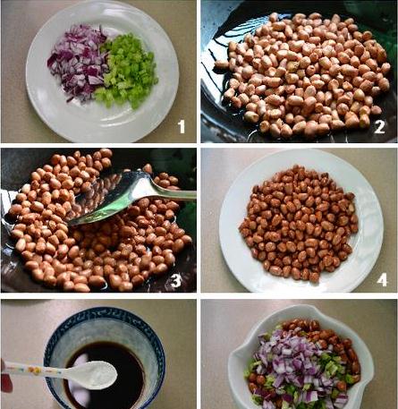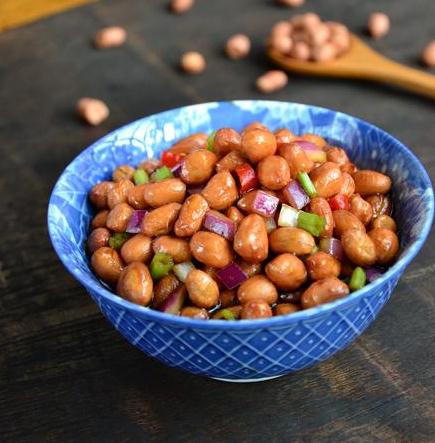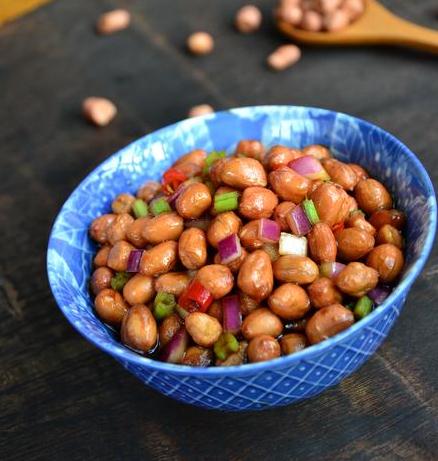 陈醋花生 用料:花生米150克 陈醋3汤匙 香芹1根 洋葱半个 花生油3汤匙白酒3滴 李锦记酱油2汤匙 盐适量 糖半汤匙 做法: ①将洋葱和香芹洗净沥干水分,然后切成细粒。 ②将净锅水分烧干,然后倒入花生油与花生米。 ③不断均匀地铲动,直到花生米碰到锅壁时声音清脆,发出叭叭的响声,且表皮变色时关火。 ④将花生米快速盛入平盘,滴几滴白酒拌匀后散热。 ⑤取一碗,将陈醋、酱油、盐、糖拌成味汁。 ⑥待花生米彻底冷却后,放入芹菜、洋葱粒,再倒入味汁拌匀,泡制半小时即成。