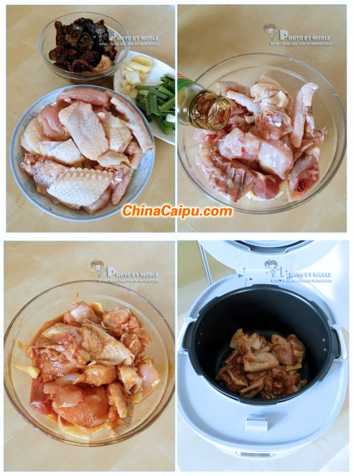 4.将腌制好的鸡肉连同腌制的料汁一起倒入压力煲;