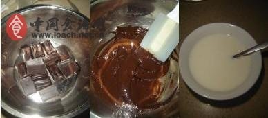 1、黑巧克力装入盆中,隔热水融化,拌匀;