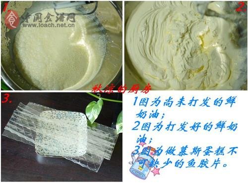 材料:安佳淡奶油250克,蛋黄两个,鲜奶150克,细砂糖40克,鱼胶片10克(两片)
