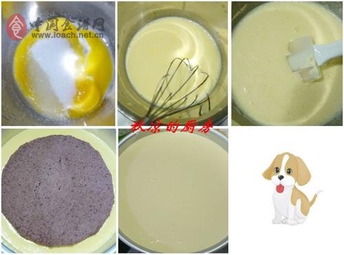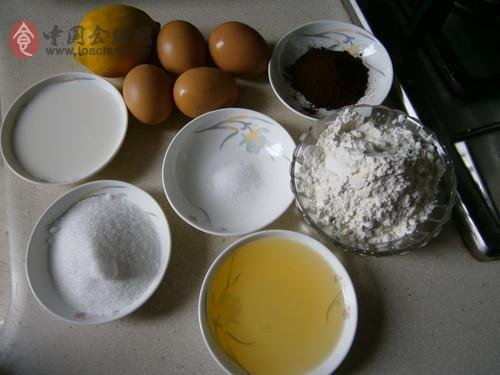 材料:鸡蛋四个,牛奶80克,玉米油60克,细砂糖70克,盐1克,低筋面粉120克,可可粉10克,柠檬汁(或白醋)几滴。
