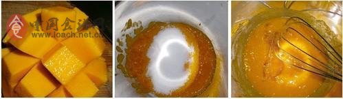 1.将芒果打成泥倒入锅中加入细砂糖用小火加热至糖熔化;
