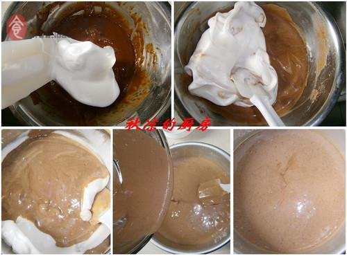 4.糖蛋白与蛋黄糊的混合:取出1/3糖蛋白,加入蛋黄糊中拌匀(一定要采取切拌的方法,不要转圈拌,以免出筋);再取出1/3糖蛋白加入到上面拌好的蛋黄糊中切拌匀;最后将上面拌好的材料全部倒回到剩余的糖蛋白中一起混合拌匀,即为可可戚风蛋糕面糊。(糖蛋白和蛋黄糊混合这一步我也经常是分两步完成,感觉也没什么大的影响)