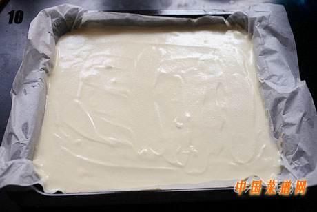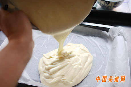 9.将面糊倒入铺好烘焙纸的烤盘中。