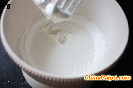 6.做蛋糕卷的蛋白不用大得太发,湿性发泡,有明显纹路,抬起打蛋器蛋白直立不弯钩就好。