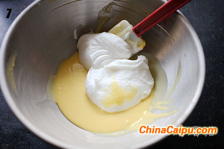 7.将打发的蛋白份三次放入蛋黄糊中,快速搅匀。