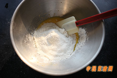 4.筛入低筋面粉,用橡皮刀画“8”字拌匀,减少面筋的出现。