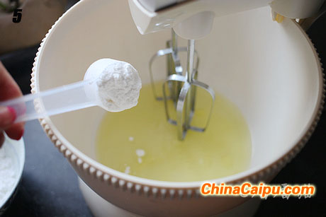 5.用电动打蛋器打发蛋清,分三次加入糖粉。
