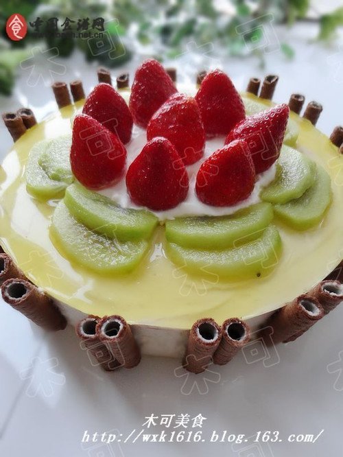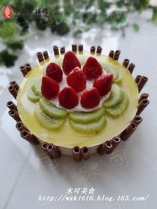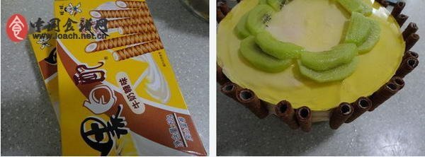 1、用电吹风沿着模具周围吹一会,或者用热毛巾捂一会就能脱模了。取出蛋糕,在周围粘上蛋卷。摆上猕猴桃片。