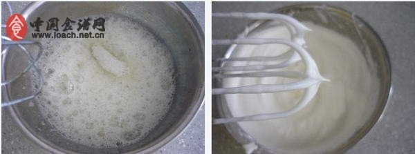 3、蛋白加几滴白醋打发,分三次加入白糖,打至干性发泡,提起打蛋器糖蛋白呈直立小三角状。