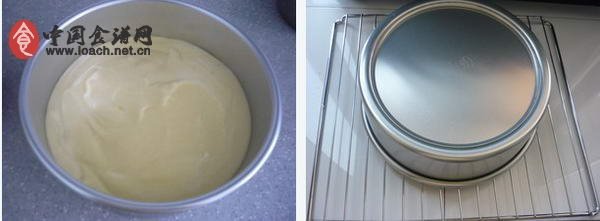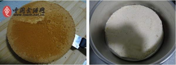 1、戚风蛋糕裁下两个约2CM厚的薄片,修剪一圈。一片比八寸活底模略小一点,另一片再小一点。稍大的蛋糕片放到模具里。
