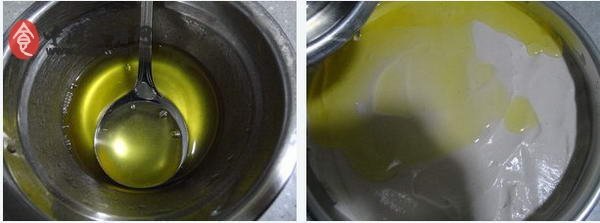 2、蛋黄搅匀,加牛奶和油搅匀。加入过筛的低粉,拿橡皮刮刀用切拌的方式拌匀,拌成蛋黄糊。
