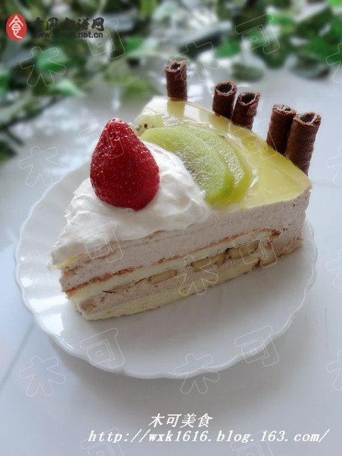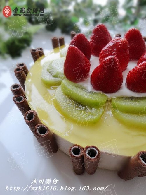 3、草莓味QQ糖加少许水,隔水融化后,在蛋糕上的水果表面刷一层,保持水果的鲜亮。一个香蕉慕斯蛋糕就完成了。