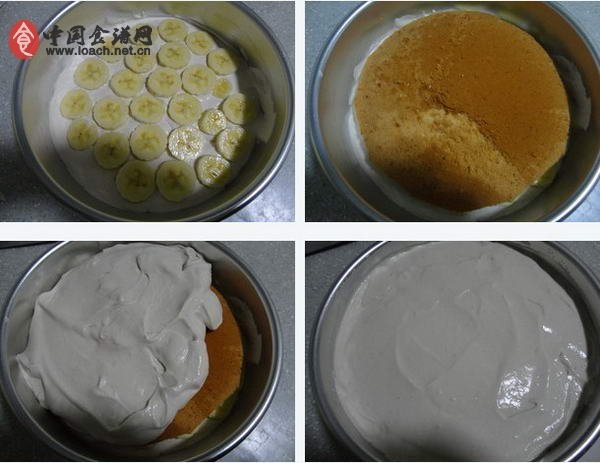 2、倒上一半慕斯馅晃匀。铺上香蕉片,再放上稍小的蛋糕片。倒入剩下的慕斯馅,晃匀后,入冰箱冷藏1小时。