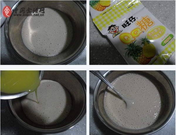 1、牛奶160克加香蕉用料理机搅打成泥,牛奶80克加QQ糖,隔水融化,放凉后,加入香蕉泥中,搅匀。