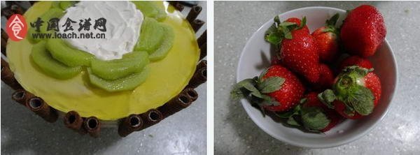 2、淡奶油100克加10克糖打发后,放到猕猴桃片中间。摆上洗净的草莓。