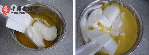 4、取三分之一的糖蛋白加入蛋黄糊中,上下翻动拌匀后,全部倒到糖蛋白中,上下翻动拌匀。