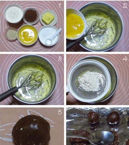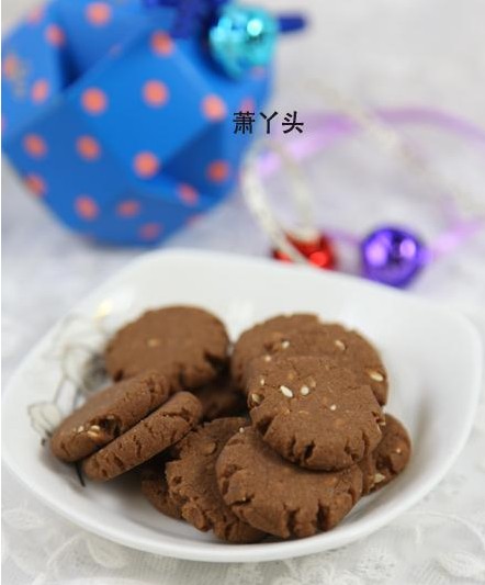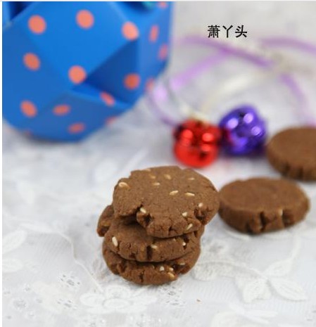 材料:低筋面粉100克、黄油45克、糖粉50克、鸡蛋液25克、可可粉10克、炒熟的白芝麻10克