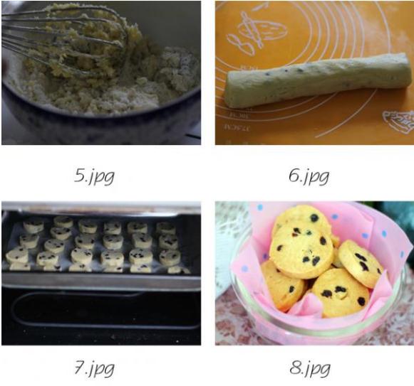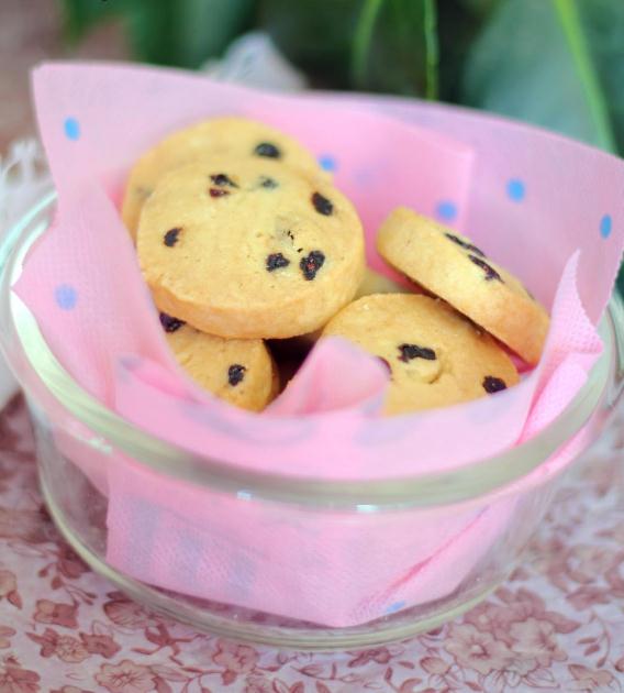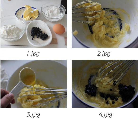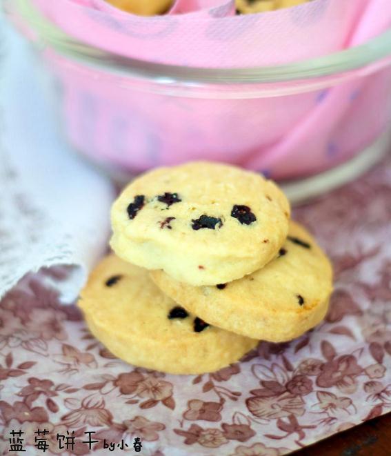 材料:低筋面粉115克,全蛋液1大勺,黄油75克,糖粉60克,蓝莓果干35克