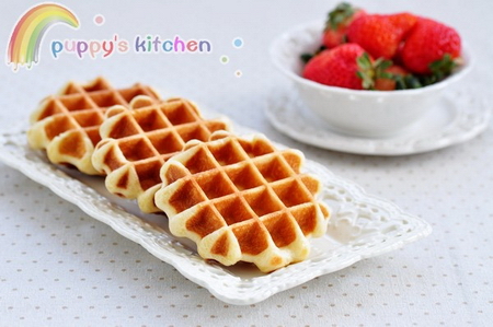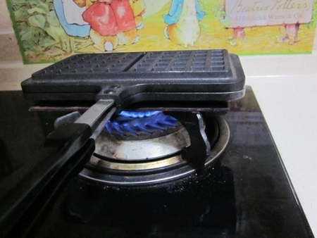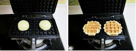 2.火候一定要掌握好。一是要用小火,并且经常看看,以免煎糊。二是要根据左右两个面团的上色程度随时调整一下模子在炉子上的位置。如果其中一个上色比较浅的话,那就把这个位置往火中间挪一挪。