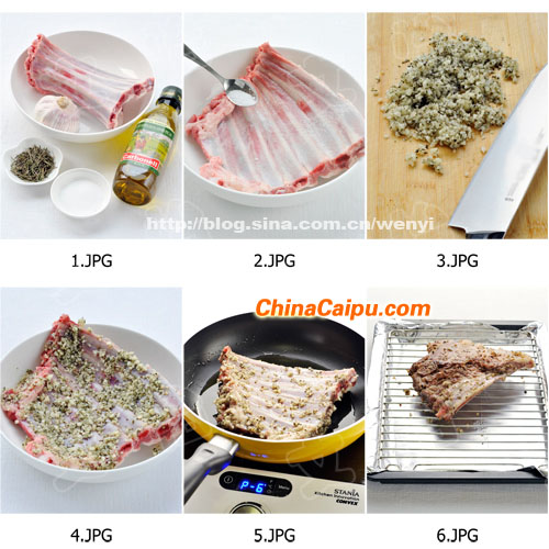 1)新鲜羊肋排洗净后,把表面水份擦干,将盐均匀的涂抹在羊排上,接着将去皮的大蒜和迷迭香混合剁成碎末,均匀的涂抹在羊排两侧,盖上保鲜膜放入冷藏室腌渍半天使其入味。