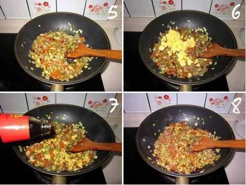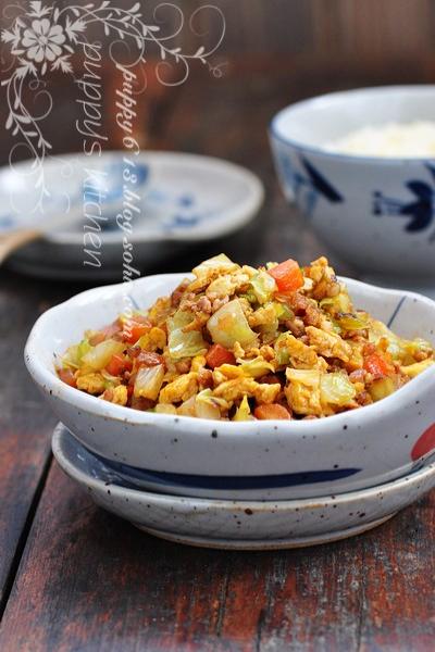 6.胡萝卜和圆白菜炒至将熟的时候倒入事先炒好的肉末和鸡蛋,快速翻炒均匀;