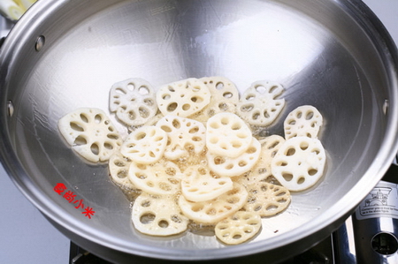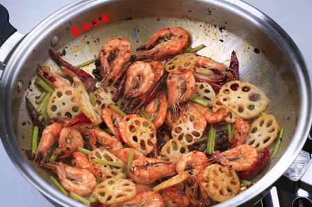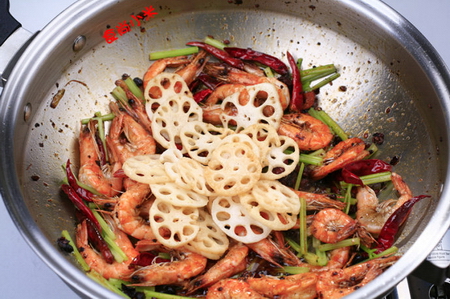 1、虾洗净,去须,背部用刀开边去沙线,洗净待用。锅内做少许油,放入藕片煸炒