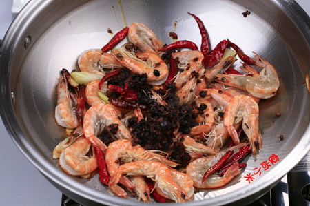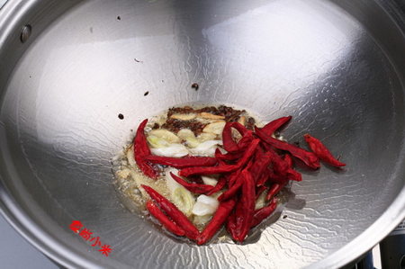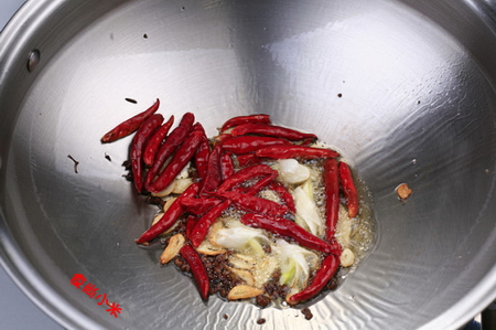 2、葱姜蒜炸透,下入红油辣酱、干辣椒,翻炒出香味烧至六七成热时,