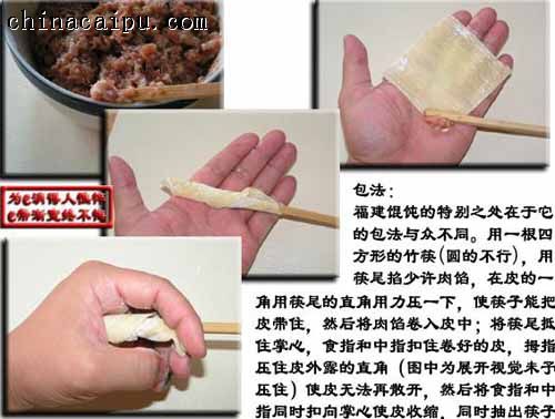 1.方型的馄饨皮,中间放一团馅,将皮在放馅的那个地方一抓,像个水母状的 .2.小馄饨的包法 将四方的皮子中间放馅后,对折成一个等腰三角型, 有馅的那边的两个角沾水一黏在一起后.3.大馄饨的包法 将四方的皮子中间放馅后 上下一折成一个长方型后,左右两手各抓有馅的那边皮子的两个角,将皮子稍稍折下后两个角一黏 .