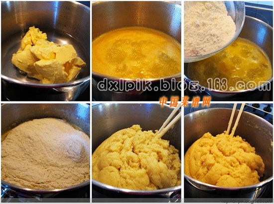 面团:低筋面粉100克、水160克、黄油80克、糖1小勺、盐1/2小勺、鸡蛋约3个