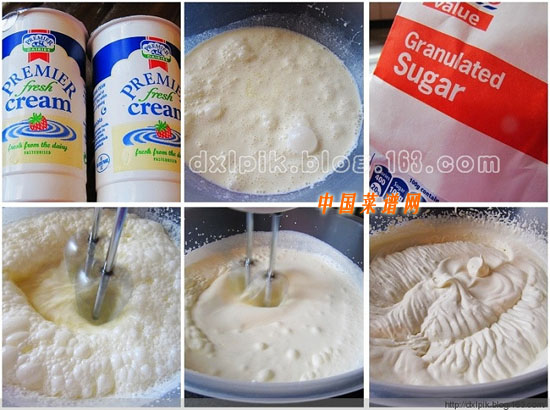13、鲜奶油倒入干净的盆中,分3次加入白砂糖,用电动打蛋器搅打。