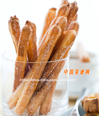 6)出炉后,在泡芙条表面薄薄地刷一层加水稀释的糖浆或蜂蜜,然后撒上砂糖即可食用。
