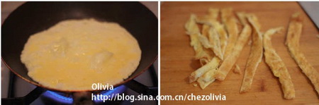 3.晾凉的鸡蛋饼,切成丝,放在盘子里备用