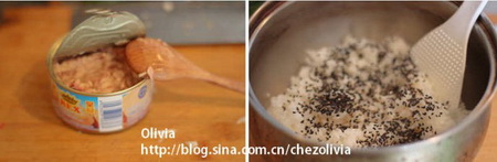10.开金枪鱼罐头,因为成块,用勺子捣成泥,备用