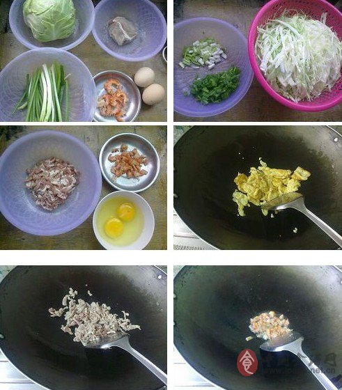 材料:包菜1个、鸡蛋2个、瘦肉、虾仁、葱、生抽、盐、油适量。