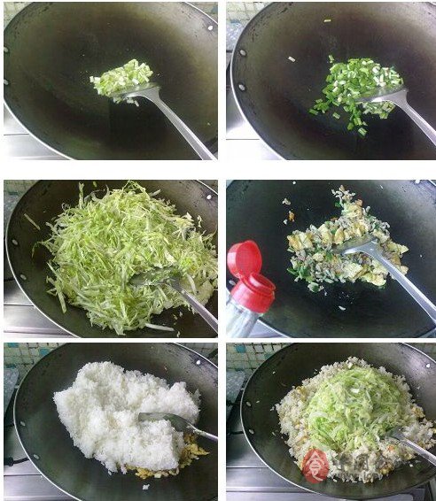 2、饭菜切丝,葱切小段。