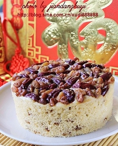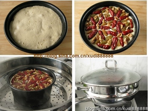 6 表面摆上去核红枣及其余部分的葡萄干和核桃仁,冷水上锅,大火烧开后蒸25分钟,关火后焖5分钟;
