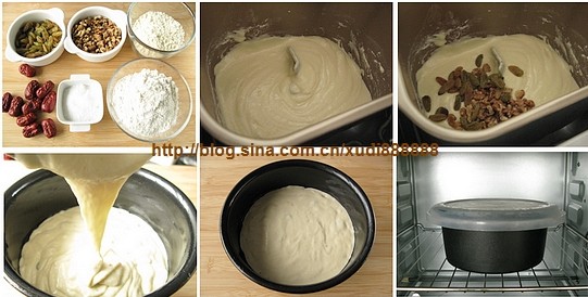 材料:玉米面粉75克、普通面粉155克、细砂糖40克、干酵母3克、无铝泡打粉5克、奶粉10克、玉米油10克、水240克、红枣6-8颗、葡萄干50克、熟核桃仁50克。